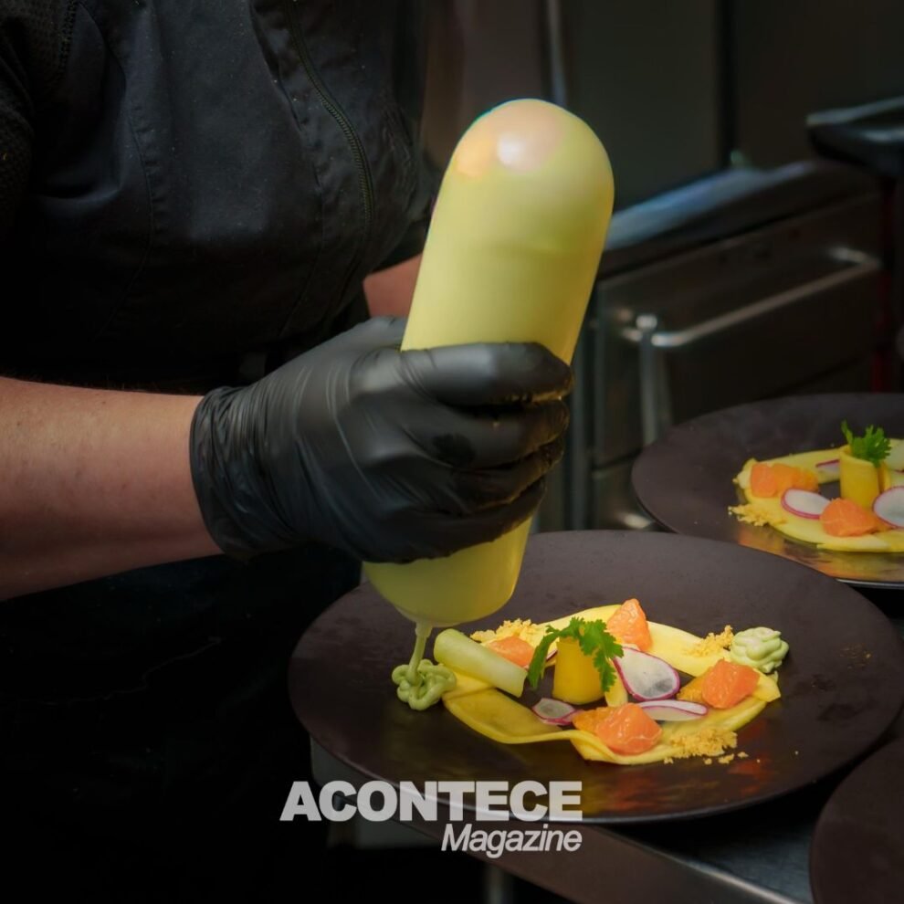 Esses ingredientes, juntos, realçam o equilíbrio perfeito entre o doce, o ácido e o crocante. O resultado é uma salada leve, colorida e cheia de personalidade: verde e amarela, elegante e rústica ao mesmo tempo. Para finalizar, uma farofinha de dendê que traz o sabor autêntico do Brasil.